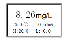 DO值為主顯示,溫度值、高低報警設(shè)置值及電流值為副顯示。正上方為當(dāng)前測量值,25.0℃為當(dāng)前溫度值,H:20.0為高點報警值,L: 0.0為低點報警值,D: 0.0為滯后量。